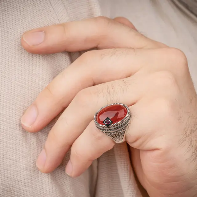 خاتم فضة عيار 925 صياغة تركية فاخرة مع حجر العقيق الأحمر الوزن التقريبي 14 غرام فترة التوصيل من 9 – 14 يوم شحن وتوصيل إلى كافة العالم